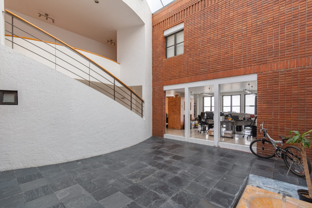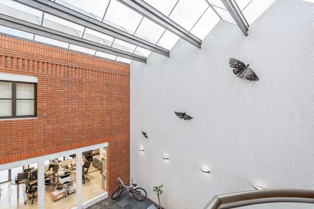 – TIENE UN AREA QUE COMUNICA EL ESPACIO COLABORATIVO CON LA COCINA Y ESTA CUBIERTA CON ESTRUCTURAS DE HIERRO Y VIDRIO